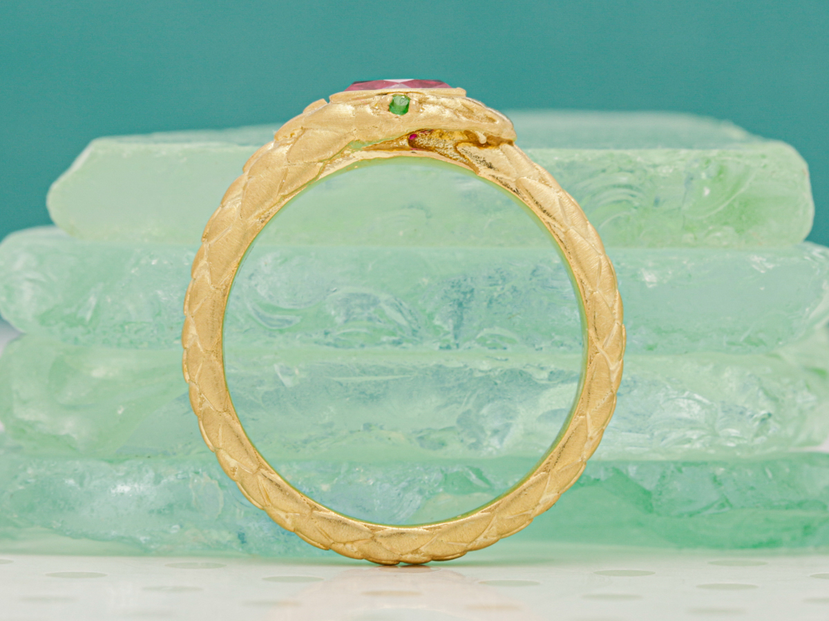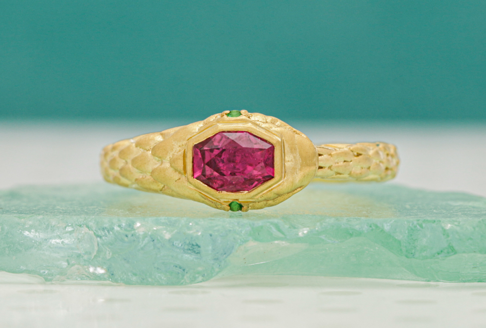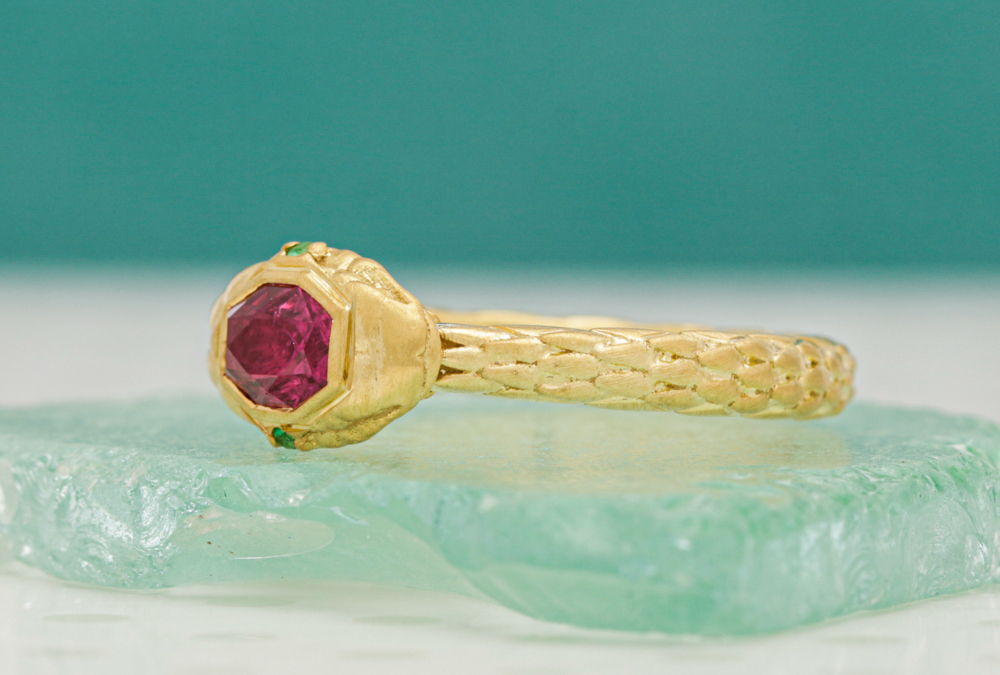 This unique ring uses one of my Afghan Tourmalines (1.665 ct.) accented with vitreous enamel.