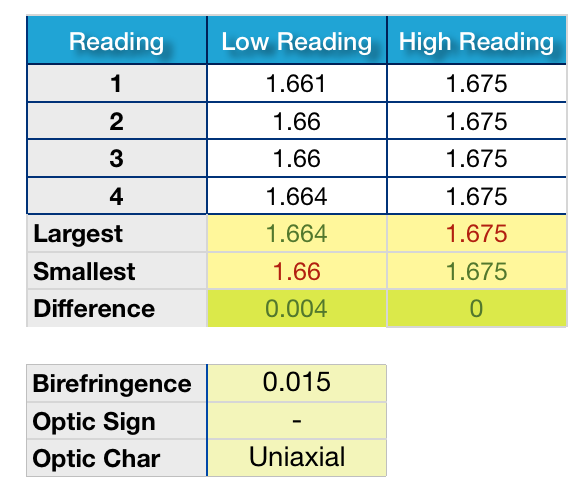A spreadsheet program that calculates the Optic Sign, Birefringence and specific Gravity of your stone based on a few simple measurements.